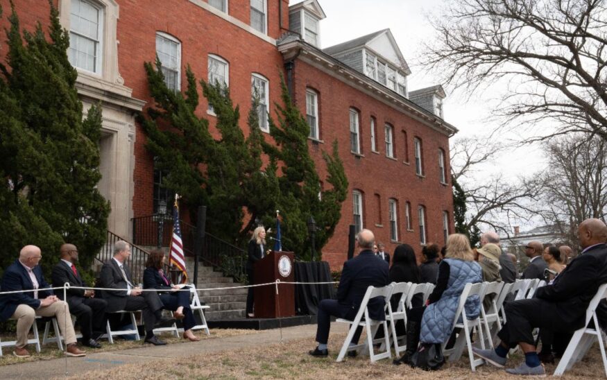 Gov. Abigail Spanberger on Feb. 18, 2026, announces that Echelon Resources will invest $20 million to redevelop two historic Fort Monroe buildings into housing. Photo courtesy Gov. Abigail Spanberger's office