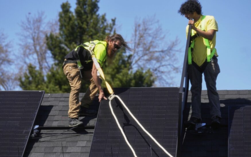Theodore Tanczuk, left, and Brayan Santos, right, of solar installer YellowLite, work to put panels on a home in Lakewood, Ohio, Wednesday, April 16, 2025. (AP Photo/Sue Ogrocki)