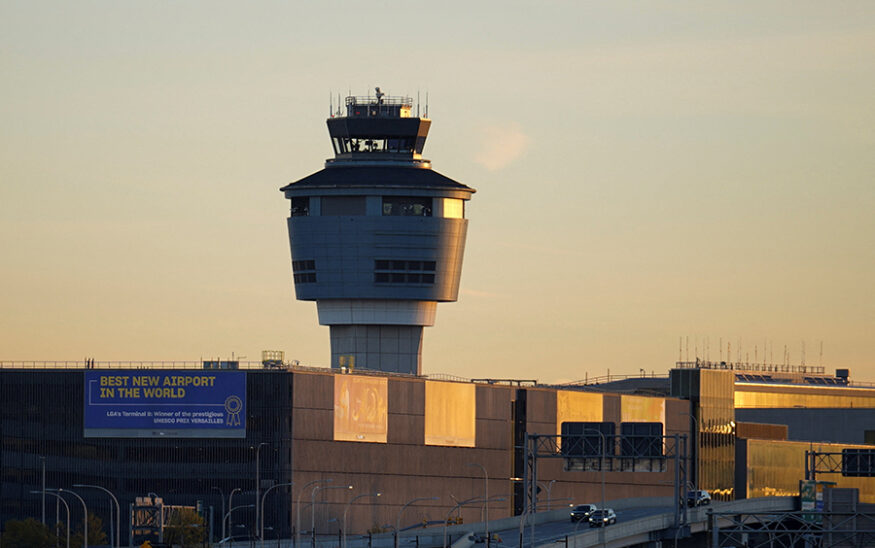 The air traffic control tower at New York's Laguardia Airport after the FAA ordered flight cuts at 40 major airports amid the ongoing U.S. government shutdown in the Queens borough of New York City, U.S., November 7, 2025. REUTERS/Ryan Murphy