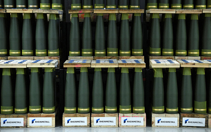 FILE PHOTO: Artillery shells are lined up in an storage room at the Loading of Ammunition and Packaging (LAP) hall of the new artillery plant of ammunition maker Rheinmetall, as the media tours the facilities on the day of its inauguration, in Unterluess, Germany, August 27, 2025. REUTERS/Annegret Hilse/File Photo