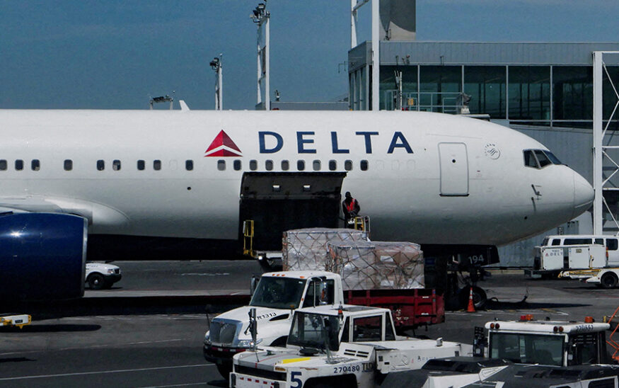 FILE PHOTO: Staff uploads packages on a Delta Air Lines plane at John F. Kennedy International Airport in Queens, New York City, U.S., April 23, 2025. REUTERS/Jeenah Moon//File Photo