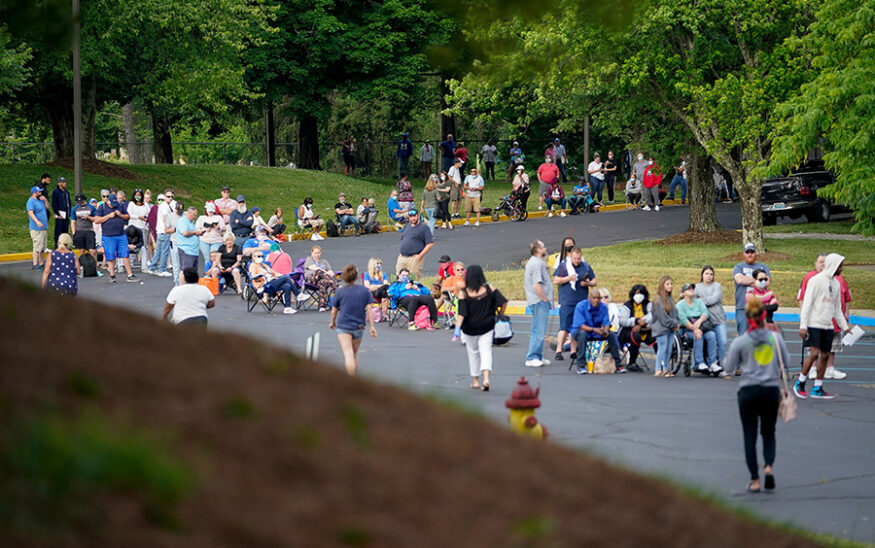 People line up outside a Kentucky Career Center hoping to find assistance with their unemployment claim in Frankfort, Kentucky, U.S. June 18, 2020. REUTERS/Bryan Woolston