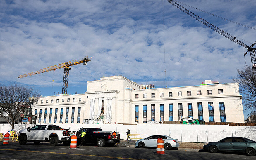 Cranes loom over the construction site of the Federal Reserve headquarters amid renovations of the building, in Washington, D.C., U.S., January 12, 2026. REUTERS/Kevin Lamarque/File Photo