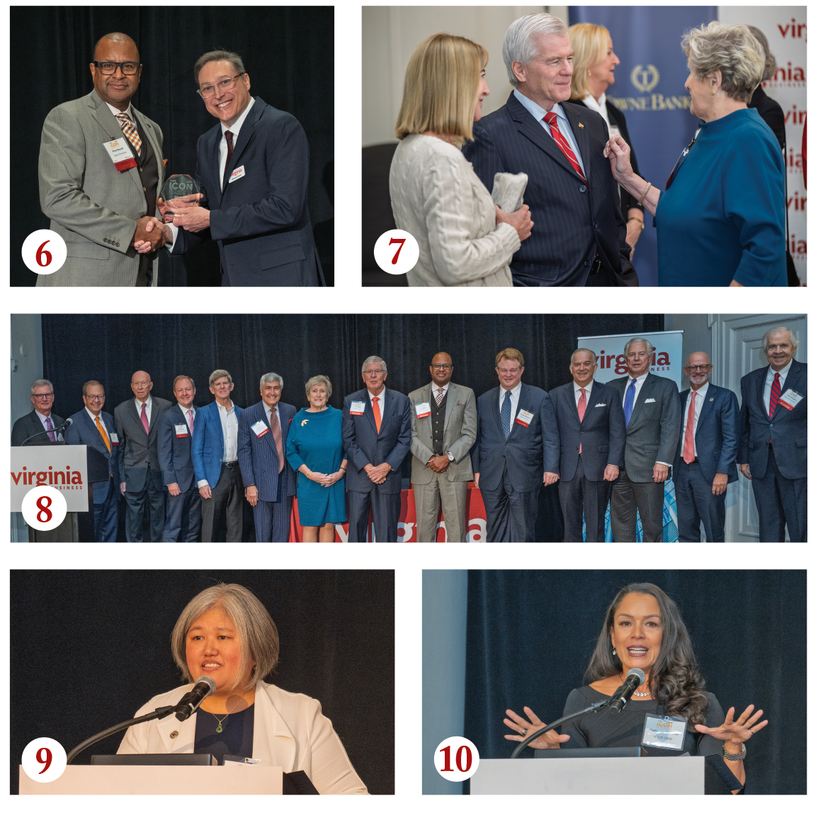 8. L to R: 2025 Icon Honors honorees Aubrey Layne of Sentara Health; former PBMares CEO Alan Witt; Crutchfield CEO Bill Crutchfield; UVA Community Health CEO Erik Shannon; Capital Square co-CEO Louis Rogers; Divaris Group Chairman and CEO Gerald Divaris; Berkshire Hathaway Homeservices RW Towne Realty CEO Barbara Wolcott; Williams Mullen Chairman Emeritus Thomas Frantz; Bank of America Richmond Market President Victor Branch; Regent University Chancellor Gordon Robertson; Genworth CEO Tom McInerney; Joe Montgomery of The Optimal Service Group of Wells Fargo Advisors; University of Mary Washington President Troy Paino; and Knox Singleton of Opportunity Scholars.