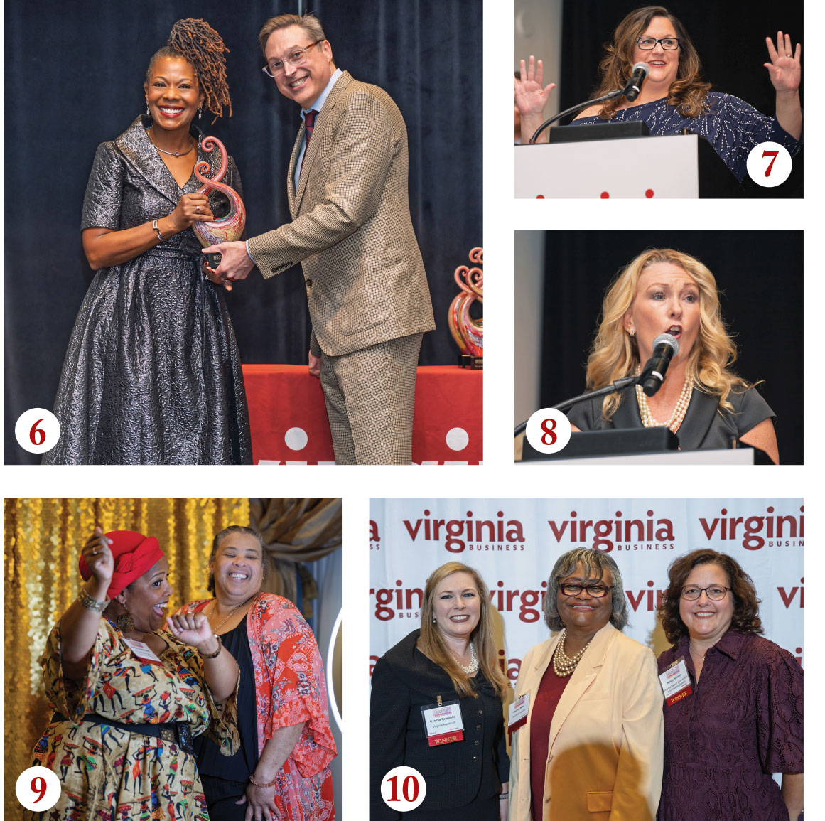 9. L to R: Charlottesville Regional Chamber of Commerce President and CEO Andrea Copeland, a Virginia Women in Leadership honoree, and her sister, Shannon Copeland 10. Virginia Women in Leadership honorees Cynthia Spanoulis, president and CEO of the Virginia Aquarium; Delceno Miles, president and CEO of The Miles Agency; and Nancy Helman, director of the Virginia Beach Convention and Visitors Bureau