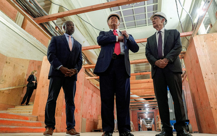 U.S. President Donald Trump, U.S. Senator Tim Scott (R-SC) and Federal Reserve Chair Jerome Powell react during a tour of the Federal Reserve Board building, which is currently undergoing renovations, in Washington, D.C., U.S., July 24, 2025. REUTERS/Kent Nishimura/File Photo