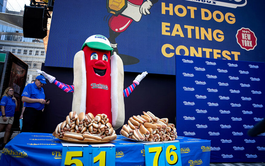 Frankie, the mascot for Nathan's Famous hot dogs, excites the audience at the official weigh-in ceremony ahead of the Coney Island's 2025 Nathan's Famous Fourth of July International Hot Dog Eating Contest in New York City on July 3. Photo by Reuters/Angelina Katsanis.