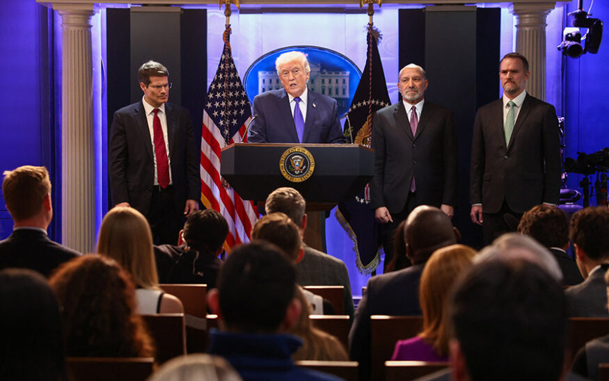 U.S. President Donald Trump, flanked by Secretary of Commerce Howard Lutnick, Trade Representative Jamieson Greer and Solicitor General D. John Sauer, speaks during a press briefing at the White House, following the Supreme Court's ruling that Trump had exceeded his authority when he imposed tariffs, in Washington, D.C., U.S., January 20, 2026. REUTERS/Kevin Lamarque