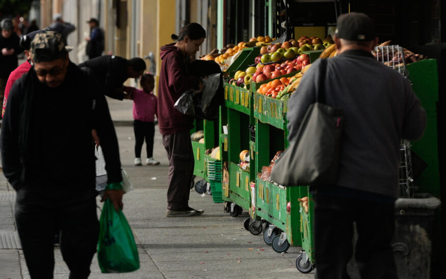 A person shops for produce at a market in San Francisco on Saturday, Nov. 15, 2025. (AP Photo/Jeff Chiu)