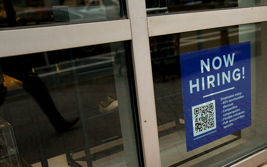 An employee hiring sign with a QR code is seen in a window of a business in Arlington, Virginia, U.S., April 7, 2023. REUTERS/Elizabeth Frantz/File Photo